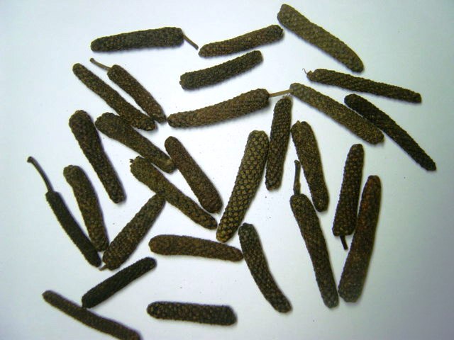 毕拨 别名:假胡椒,怕克 为;胡椒科 (Piperaceae)胡椒属 (Piper) 产;勐海、勐腊、景洪、耿马、蒙自、河口、盈江、孟连、元阳;生于海拔580—600米常绿林中或村旁湿地上。分布于福建、广东、广西、贵州及西藏。印度、越南、马来西亚、菲律宾、印度尼西亚、巴布亚新几内亚也有。版纳,巍山弥渡 多年生、匍匐、逐节生根草本、茎长约10米;小枝近直立,幼时被微柔毛,老时脱落,茎圆柱形,直径约2—4毫米,节膨大。叶薄纸质或近膜质,有细腺点,下部的阔卵形或近圆形,长7—14厘米,宽6—13厘米,顶端短尖,基部心形或稀有截平,两侧近相等,腹面无毛,背面沿脉上被极细的粉状短柔毛,叶脉5—7条,干时呈苍白色,在背面明显凸起,最上1对离基1—2厘米从中脉发出,弧形上升至叶片顶部与中脉汇合,网脉明显;上部的叶小,卵形或卵状披针形,基部浅心形,叶柄长2—5厘米,被极细的粉状短柔毛,匍匐茎的叶柄长可达7.5—12厘米;叶鞘长约为叶柄之半。花单性,雌雄异株,聚集成与叶对生的穗状花序。雄花序长1.5—2厘米,直径约2—3毫米;总花梗与花序等长或略短,被极细的粉状短柔毛;花序轴被毛;苞片扁圆形,近无柄,盾状着生,直径0.5—0.6毫米;雄蕊2枚,花药近球形,2裂,花丝甚短。雌花序长约6—8毫米,于果期稍延长;花序轴无毛;苞片圆形,盾状,直径1—1.3毫米;柱头4,稀3或5,被微柔毛。浆果近球形,具4角棱,无毛,直径2.5—3毫米,基部嵌生于花序轴中并与其合生。 功用;芳香开窍辟秽毕拨是制作食品和食用香精的母体香料。调配各种食用、医药和化工原料,产品配方多种.用途广.“毕拨香”在香辛料中.是很重要基础原辅材料及调料.在(味记王)食品料理.香辛料.调味品调料配方中.作为配伍使用.因而被广泛用于调制高级香精。 ★查看毕拨、毕拨串、毕拨粒、毕拨粉,全文.产品规格及卫生理化指标.技术资料.毕拨、毕拨串、毕拨粒、毕拨粉 |